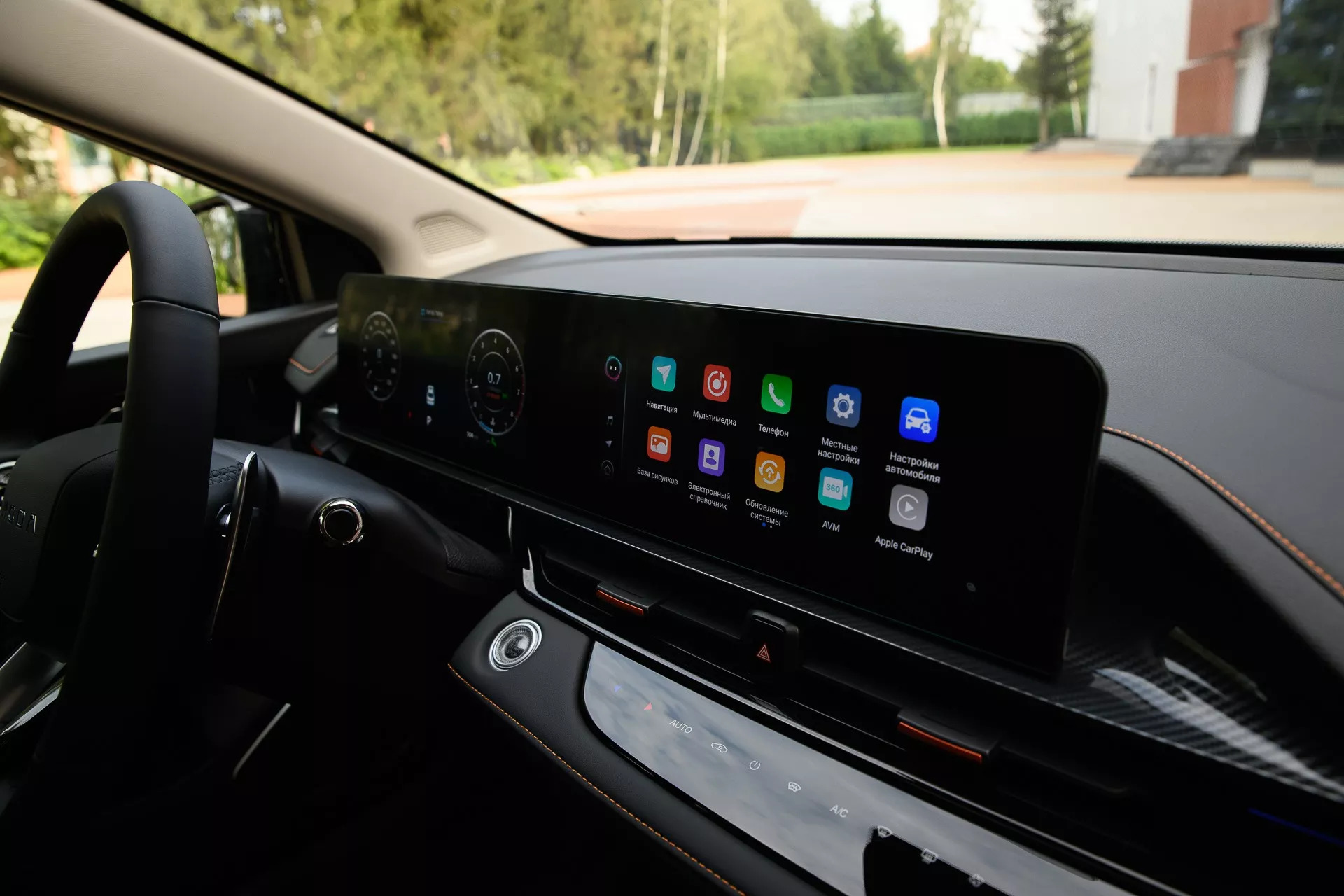 Приборная панель и центральный дисплей на OMODA S5 GT объединены в единый панорамный блок, диагональ каждого экрана – 10,25 дюймов. Левый экран исполняет роль цифровой панели приборов, в то время как правый сенсорный используется для отображения важной информации об автомобиле. При этом водителю доступны три темы для оформления дизайна экранов.